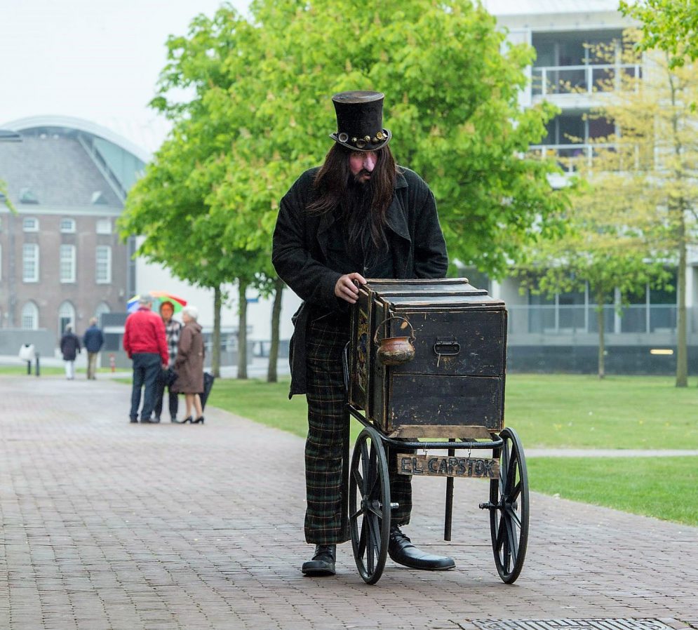 De speelman Eduardo El Capstok, een man met baard zeult met een zware kist. Uit die kist komt muziek.